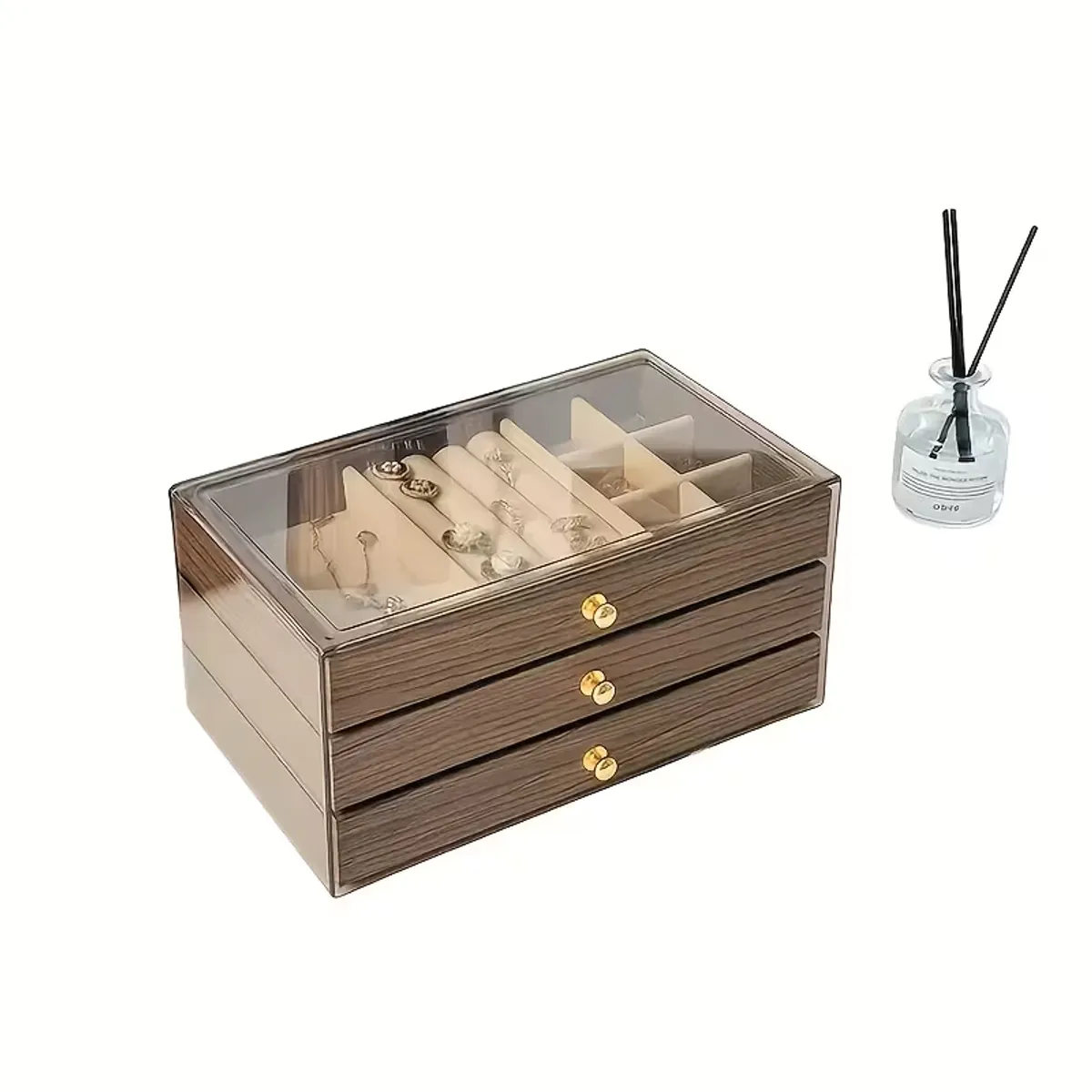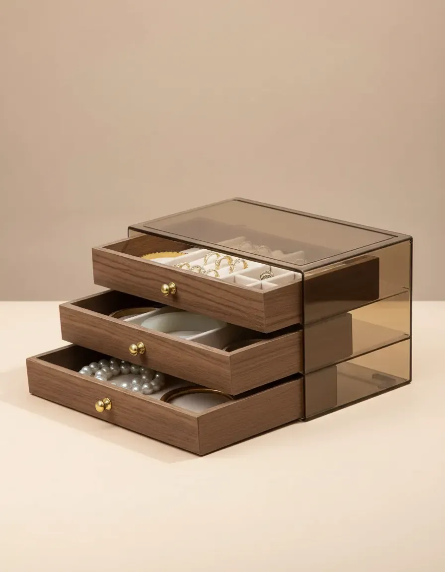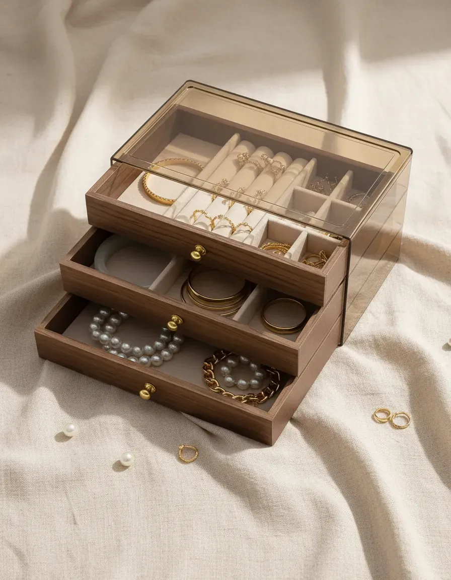 Este organizador de joyería de diseño moderno vintage es la solución perfecta para almacenar y exhibir tus collares, aretes, pulseras y anillos. Con su estructura de 3 capas y cajones apilables, maximiza el espacio de almacenamiento mientras mantiene tus joyas ordenadas y libres de enredos.