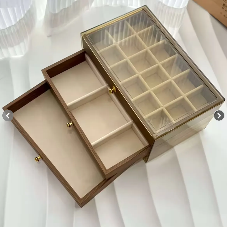 Cuenta con un forro de terciopelo suave que protege tus joyas delicadas de arañazos y daños, y un estante de exhibición superior que permite mostrar tus piezas favoritas de forma elegante. Fabricado con materiales duraderos, combina la rusticidad de la madera y la practicidad del plástico, adaptándose tanto para uso doméstico como para exhibición en tiendas minoristas.